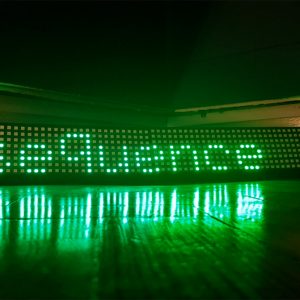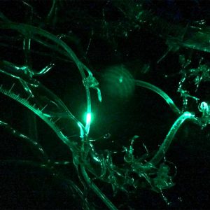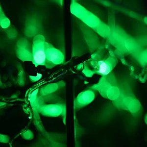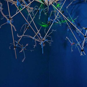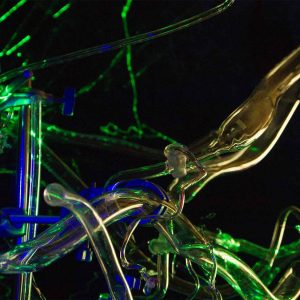 This installation uses refractive properties of reformed scientific glassware to create a dramatic reimagining of neuronal (brain cell) activities. Robotic lasers are programmed to trace light pathways across a forest of glass neurons creating, which create elaborate caustic patterns of light highly evocative of the electric pulses of energy passing across networks of braincells.