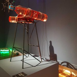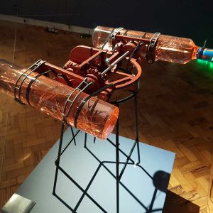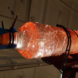 Large lab flasks, rubber straps, liquid glucose, food colouring, glass fragments, motor, ply structure + gearing mechanism, lab stool, power supply.